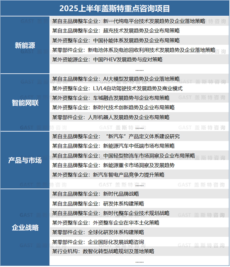 蓋斯特在2025年上半年取得的成果,源于洞察創(chuàng)造價(jià)值的初心和客戶(hù)的信任。自2013年成立至今,蓋斯特累計(jì)完成各類(lèi)企業(yè)、地方政府及行業(yè)組織的重大戰(zhàn)略研究及咨詢(xún)項(xiàng)目近750項(xiàng),累計(jì)輸出汽車(chē)產(chǎn)業(yè)與技術(shù)戰(zhàn)略研究報(bào)告1700余份。今后我們將持續(xù)深化研究,以前瞻的趨勢(shì)判斷、精準(zhǔn)的解決方案、深度的落地支持,陪伴客戶(hù)穿越產(chǎn)業(yè)變革周期。無(wú)論您面臨戰(zhàn)略轉(zhuǎn)型、組織變革和管理提升,還是技術(shù)路線選擇、產(chǎn)品規(guī)劃、全球化布局等挑戰(zhàn),蓋斯特都愿意成為您最可靠的戰(zhàn)略伙伴,攜手共創(chuàng)“新汽車(chē)”時(shí)代的新增長(zhǎng)空間。