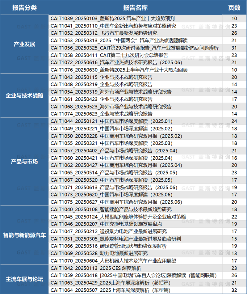 除了定制化咨詢(xún)服務(wù)外,蓋斯特持續(xù)深耕產(chǎn)業(yè)與技術(shù)戰(zhàn)略研究。2025年上半年我們?cè)诋a(chǎn)業(yè)發(fā)展、技術(shù)戰(zhàn)略、產(chǎn)品市場(chǎng)、智能與新能源等領(lǐng)域,共計(jì)形成38期、737頁(yè)中英日文研究報(bào)告,并通過(guò)汽車(chē)產(chǎn)業(yè)與技術(shù)研究會(huì)(CAIT)平臺(tái),定向共享給國(guó)內(nèi)外整車(chē)企業(yè)、供應(yīng)商、科技企業(yè)以及部分行業(yè)組織等60余家會(huì)員單位,為會(huì)員單位的發(fā)展提供系統(tǒng)化前瞻研究支撐。以下我們選出受關(guān)注較高的三個(gè)重點(diǎn)研究成果進(jìn)行簡(jiǎn)要介紹。