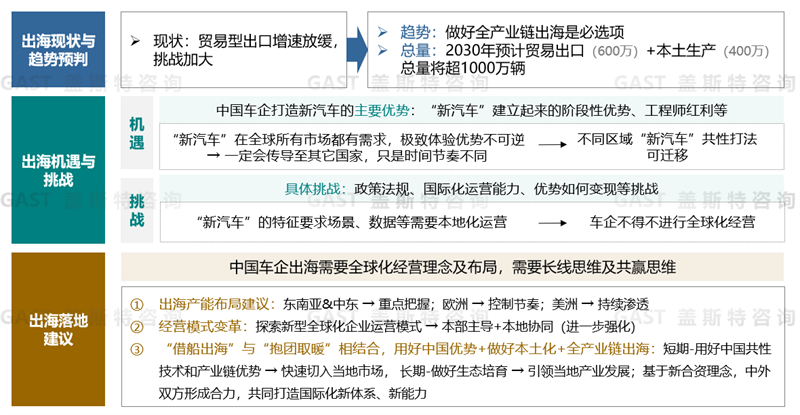 本報(bào)告指出“全產(chǎn)業(yè)鏈出海+本地化運(yùn)營(yíng)”是必選路徑。預(yù)計(jì)2030年中國(guó)汽車(chē)出海總量將突破1000萬(wàn)輛,其中貿(mào)易型出口600萬(wàn)輛,本地化生產(chǎn)400萬(wàn)輛。研究特別提出,“新汽車(chē)”屬于在全球市場(chǎng)的共性需求,只是各地發(fā)展時(shí)間節(jié)奏不同,中國(guó)車(chē)企在此方面建立了階段性領(lǐng)先優(yōu)勢(shì),又兼具工程師紅利,但同時(shí)面臨海外政策法規(guī)、國(guó)際化運(yùn)營(yíng)、場(chǎng)景數(shù)據(jù)本地化要求等挑戰(zhàn),因此中國(guó)車(chē)企需以全球化經(jīng)營(yíng)與布局的長(zhǎng)線思維,“借船出?!迸c“報(bào)團(tuán)取暖”相結(jié)合,短期依托共性技術(shù)與產(chǎn)業(yè)鏈優(yōu)勢(shì)快速切入海外市場(chǎng),長(zhǎng)期通過(guò)生態(tài)培育引領(lǐng)當(dāng)?shù)禺a(chǎn)業(yè)發(fā)展,以新合資理念構(gòu)建國(guó)際化運(yùn)營(yíng)能力體系。