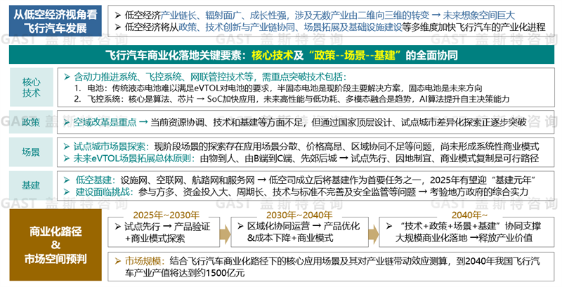 報(bào)告立足低空經(jīng)濟(jì)發(fā)展,系統(tǒng)梳理飛行汽車(chē)商業(yè)化落地的技術(shù)、政策、場(chǎng)景和基建四大關(guān)鍵要素,研究預(yù)判其商業(yè)化路徑和市場(chǎng)空間。蓋斯特提出,低空經(jīng)濟(jì)是耐心產(chǎn)業(yè),需要各參與方放眼長(zhǎng)遠(yuǎn),同時(shí)腳踏實(shí)地推進(jìn)。實(shí)現(xiàn)飛行汽車(chē)大規(guī)模商業(yè)化運(yùn)營(yíng),既需要核心技術(shù)突破,也需要“政策—場(chǎng)景—基建”的全面生態(tài)化協(xié)同,以支撐產(chǎn)品性能提升、成本下降,逐步向大眾用戶(hù)普及,從而構(gòu)建完整商業(yè)閉環(huán),釋放出產(chǎn)業(yè)價(jià)值。經(jīng)研究測(cè)算,隨著核心技術(shù)突破與生態(tài)完善,飛行汽車(chē)的核心應(yīng)用場(chǎng)景及其對(duì)產(chǎn)業(yè)鏈帶動(dòng)效應(yīng)逐步放大,預(yù)計(jì)到2040年中國(guó)飛行汽車(chē)產(chǎn)業(yè)產(chǎn)值將達(dá)1500億元。此報(bào)告為企業(yè)布局低空經(jīng)濟(jì)提供從技術(shù)選型到市場(chǎng)規(guī)劃的全方位洞察。