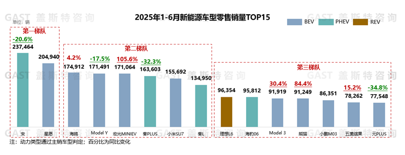 上半年,比亞迪在TOP15中占據(jù)6席,但旗下多數(shù)車型銷量同比下滑;從動(dòng)力形式看,TOP15中純電車型占據(jù)10席,處于主導(dǎo)地位。具體來看,宋系列:受外部同級競品增多及內(nèi)部產(chǎn)品分流影響,上半年銷量同比下滑超20%;吉利星愿:通過多次推出現(xiàn)金優(yōu)惠及免息政策,銷量實(shí)現(xiàn)連續(xù)6個(gè)月正增長;Model Y:因新款切換周期及自主品牌競品增多,上半年銷量下滑近20%;小米SU7:月銷量連續(xù)9個(gè)月保持在2萬輛以上;宏光MINIEV在四門款帶動(dòng)下,上半年整體銷量同比增長超1倍;理想L6推出智能煥新版,帶動(dòng)其月銷量連續(xù)4個(gè)月穩(wěn)定在1.6萬輛以上;海豹06:插混版保持較高銷量,且純電版上市帶來新增量,使得其6月銷量重回2萬輛以上;Model 3:借助限時(shí)金融優(yōu)惠,上半年累計(jì)銷量恢復(fù)30%正增長。
