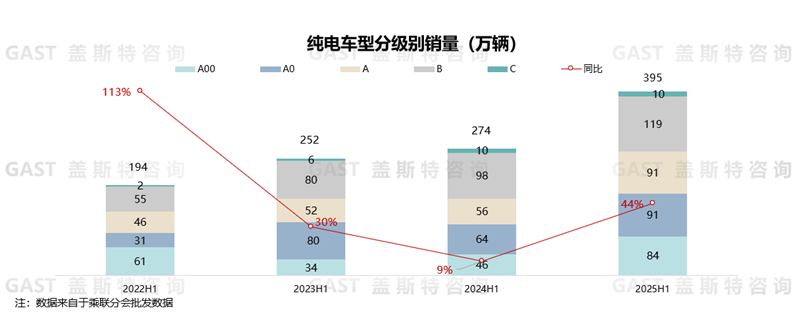 2025年上半年,純電市場批發(fā)量達(dá)395萬輛,同比增長121萬輛。除C級市場外,各細(xì)分市場均顯著增長,其中A級及以上市場純電份額大幅提升。