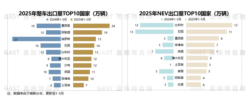 從整體出口量的市場分布來看,俄羅斯市場大幅下滑,因當(dāng)?shù)仄囘M(jìn)口關(guān)稅提升、需求疲軟及去年經(jīng)銷商庫存堆積等因素,1-5月中國對俄汽車出口量同比下滑超50%,降至中國第三大出口國;與之形成對比的是,新興市場實(shí)現(xiàn)了替代性增長,墨西哥、阿聯(lián)酋憑借對美國、中東地區(qū)的轉(zhuǎn)口優(yōu)勢,累計(jì)出口增幅均超20%,墨西哥更是超越俄羅斯成為中國最大汽車出口國。