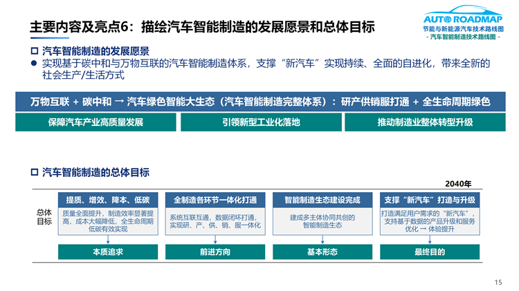 6.描繪了汽車(chē)智能制造的發(fā)展愿景和總體目標(biāo): 實(shí)現(xiàn)基于碳中和與萬(wàn)物互聯(lián)的汽車(chē)智能制造體系,支撐“新汽車(chē)”實(shí)現(xiàn)持續(xù)、全面的自進(jìn)化,帶來(lái)全新的社會(huì)生產(chǎn)/生活方式